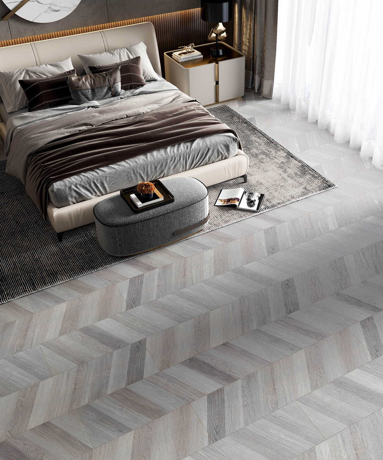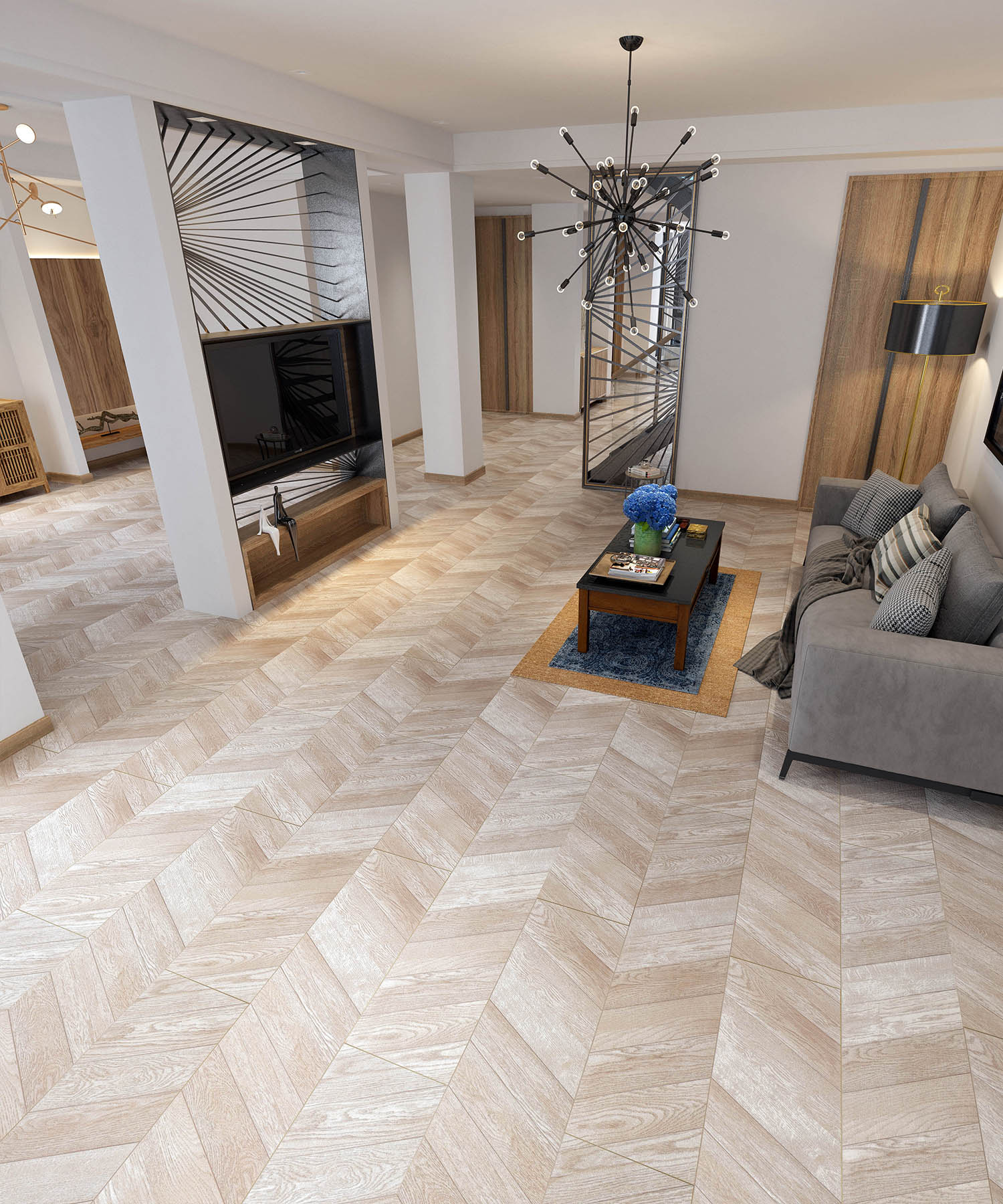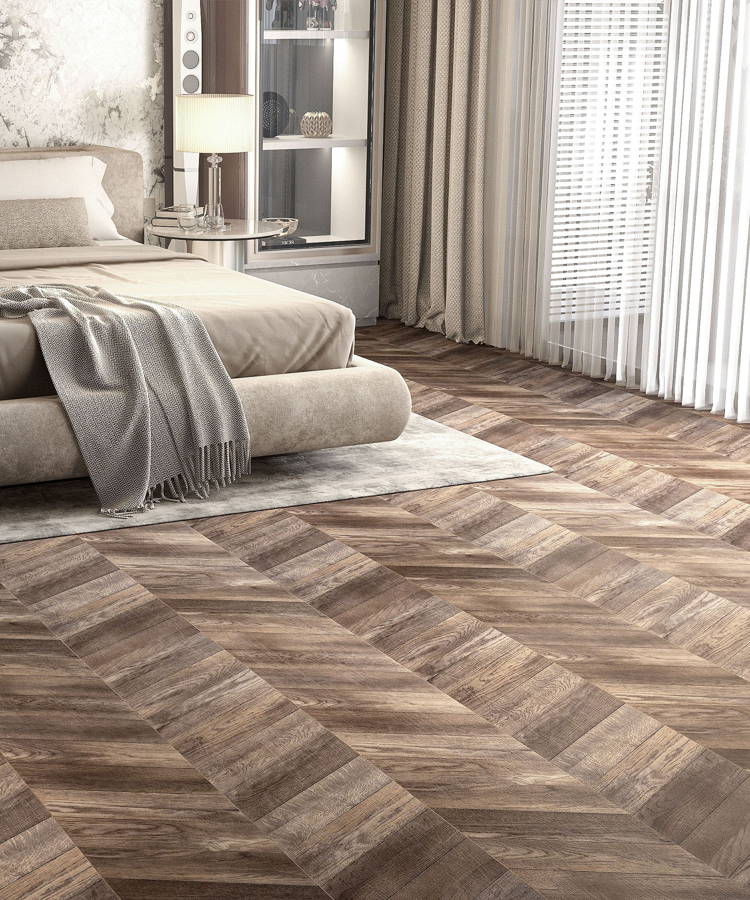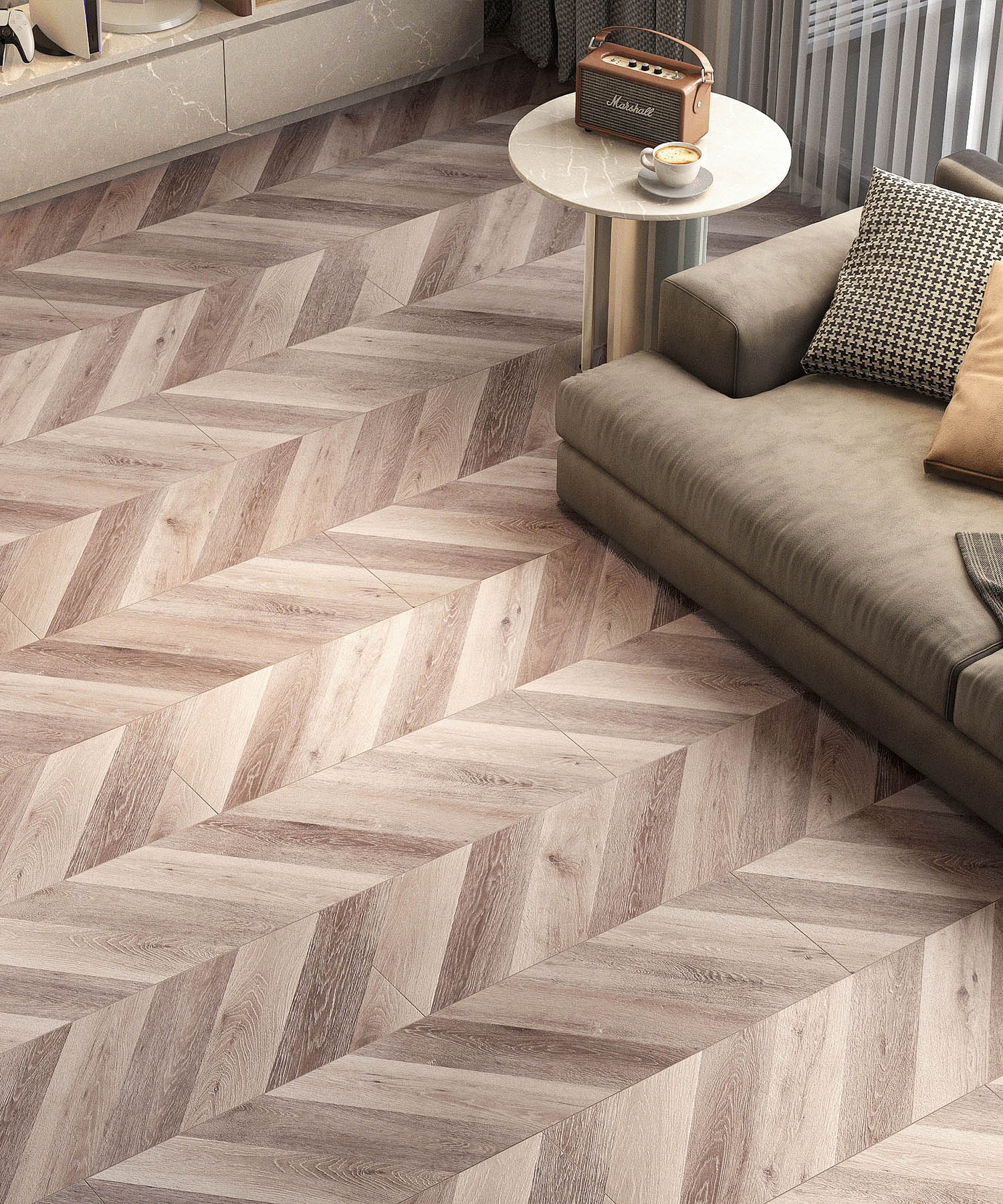 Chevron-A decorative design made up of angled cross hatching. Its traditional and elegant look enhances classic interiors. The "V" shape which is what makes Chevron wood flooring so distinctive.